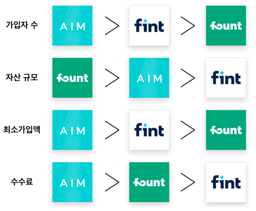 한국의 대표적인 3대 로보어드바이저 업체로 자주 소개되는 곳은 파운트·핀트·에임이다. 같은 로보어드바이저라고 하지만 에임은 투자 자문 업체로 분류되는 반면 핀트는 투자 일임 서비스만 제공하고 있다. 파운트는 투자 자문과 투자 일임 서비스를 모두 제공하고 있다.
