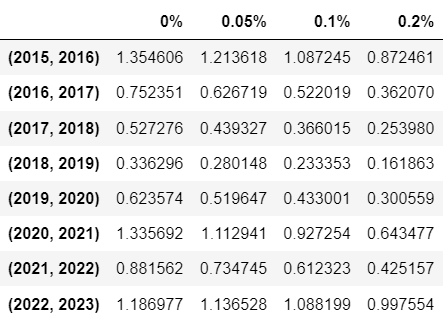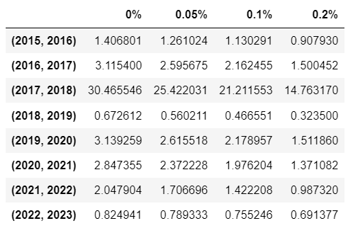 result_df = pd.DataFrame({"0%" : total_cumror_list[0], "0.05%" : total_cumror_list[1], "0.1%" : total_cumror_list[2], '0.2%' : total_cumror_list[3]}, index = total_year_list[0])