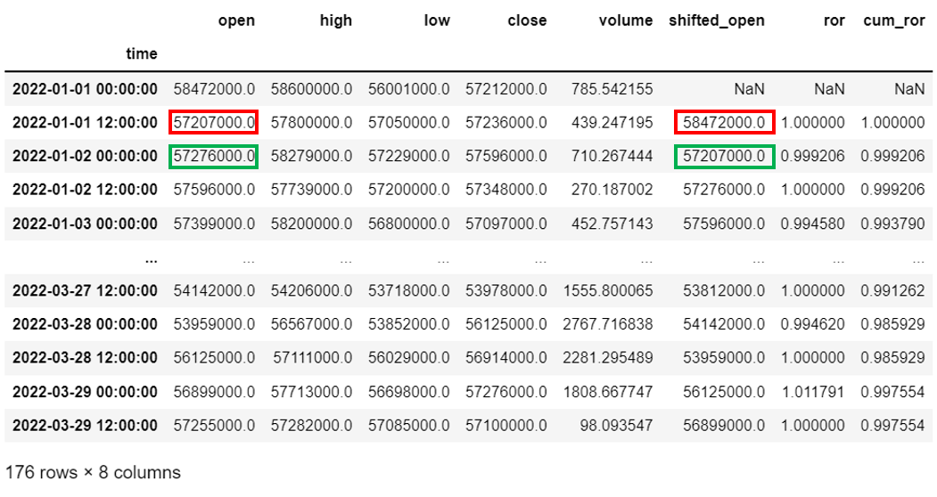 하지만, 00시일때의 경우, ror이 1인데 여기서 위와 동일하게 적용하면 안된다. 왜냐하면, 00시의 open에서 shifted_open를 나누게 되면, 01월 01일날 12시에 사서 01월 02일날 00시에 파는것과 동일하게 되므로, 이건 오버나잇 매수가 아니다. (빨간박스)