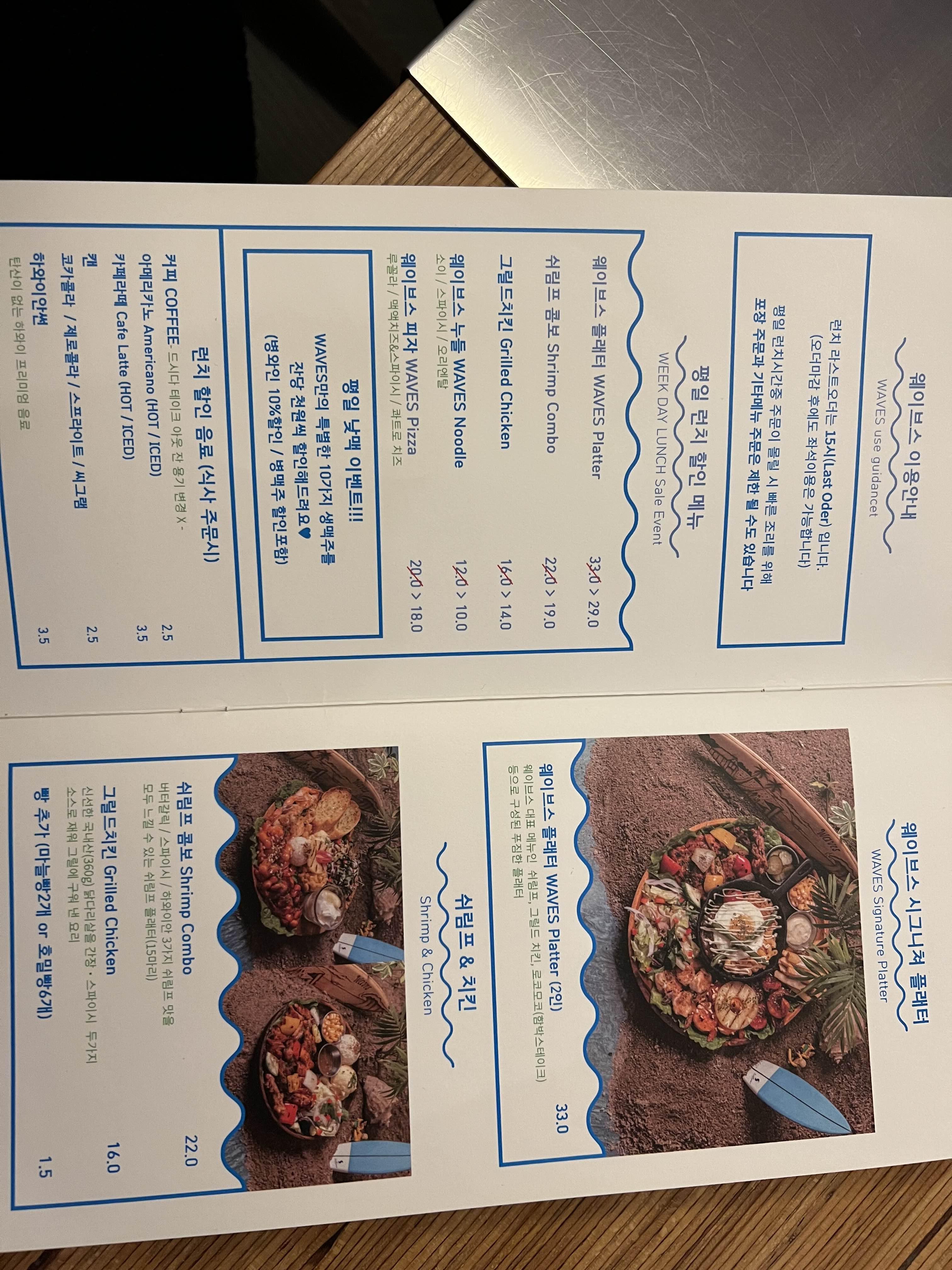 음식은 플레이터, 피자, 누들등이 있었고 술은 칵테일, 맥주, 와인등이 있었다. 우리는 웨이브스 플레이터와 스파이시 누들을 시켰다.