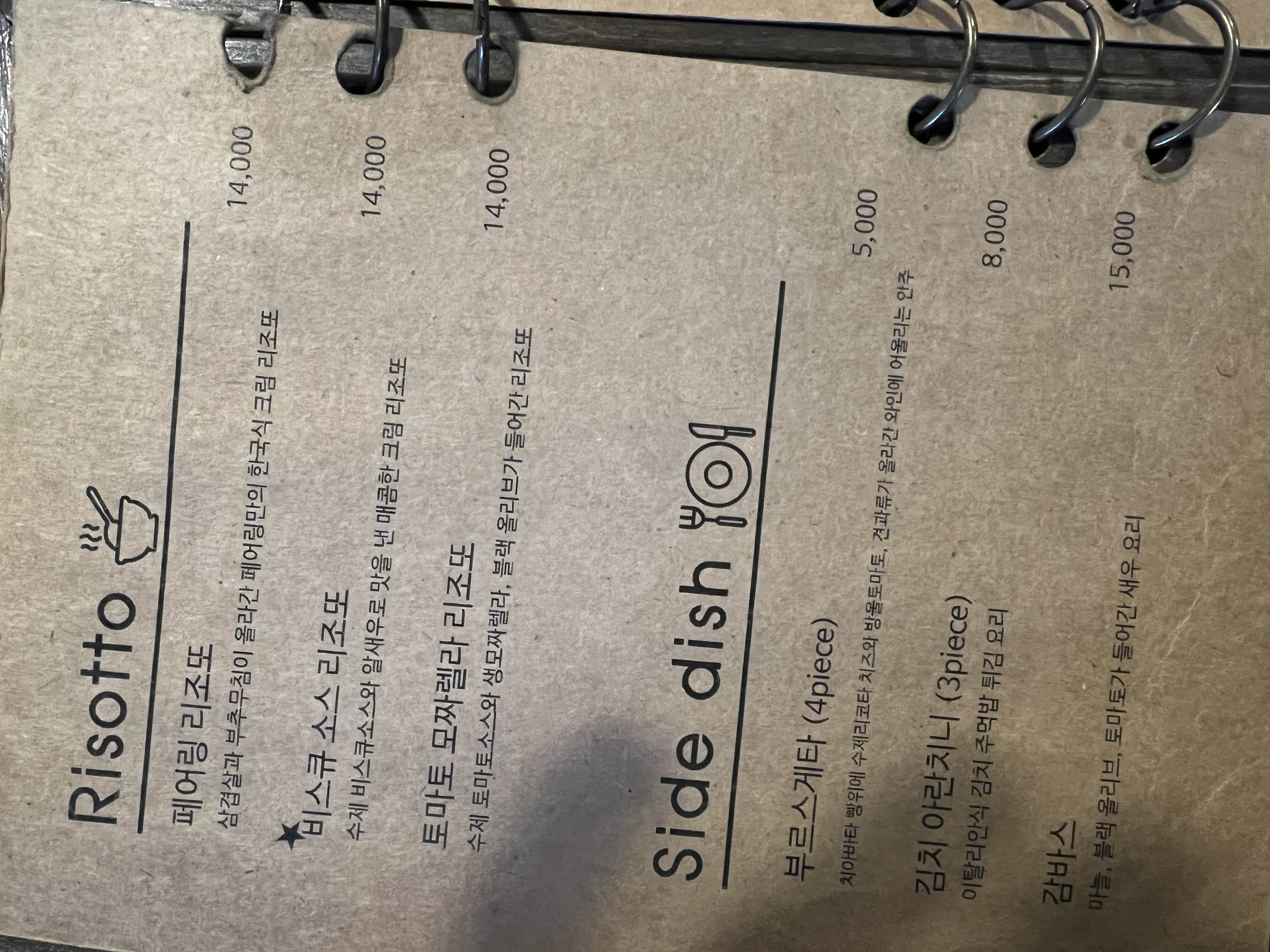 메뉴판은 아래에 있다. 스테이크는 사라졌고 파스타랑 리소또 그리고 사이드가 있다.
