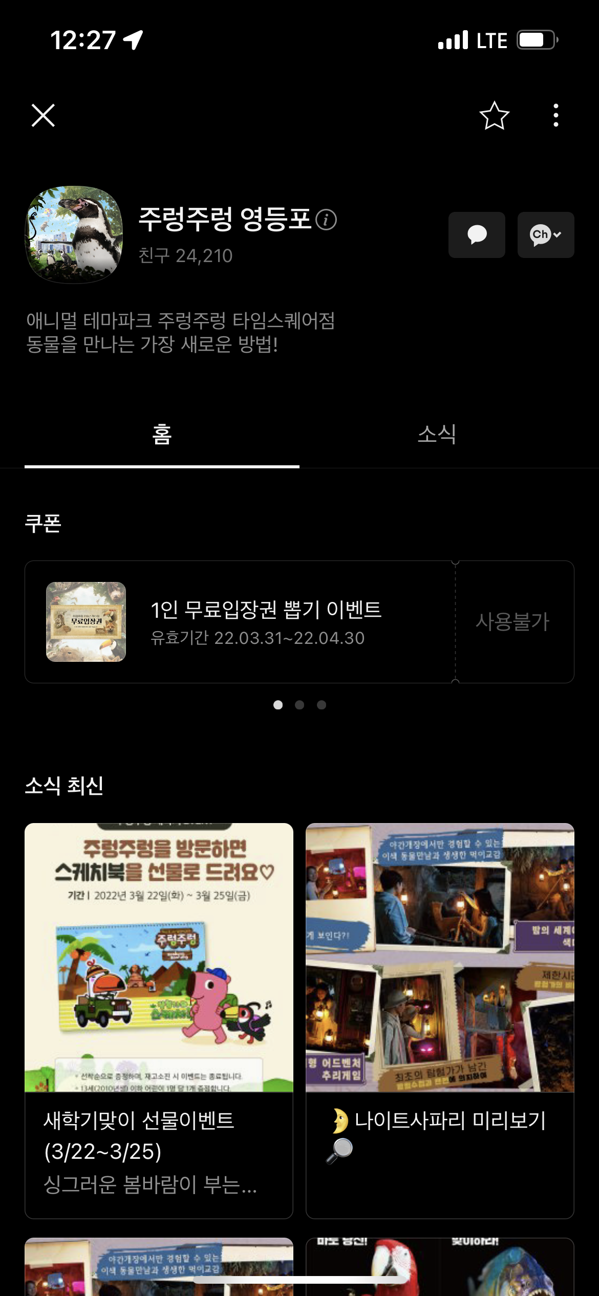 보니까 카카오톡에서 주렁주렁을 친구추가하면 1인무료입장권 뽑기 이벤트를 매달 하는데 확률이 50%라고 한다. 그래서 했지만 아쉽게 당첨되지는 않았다. (매달 한다고 하니 추천한다)