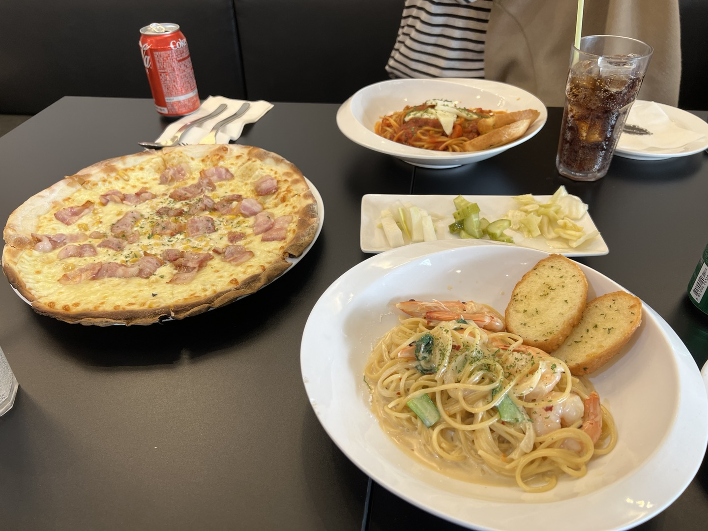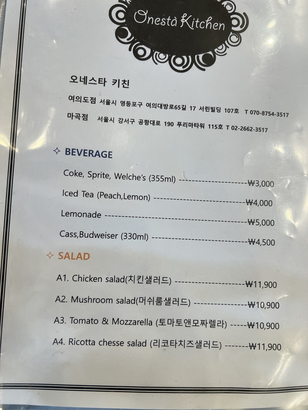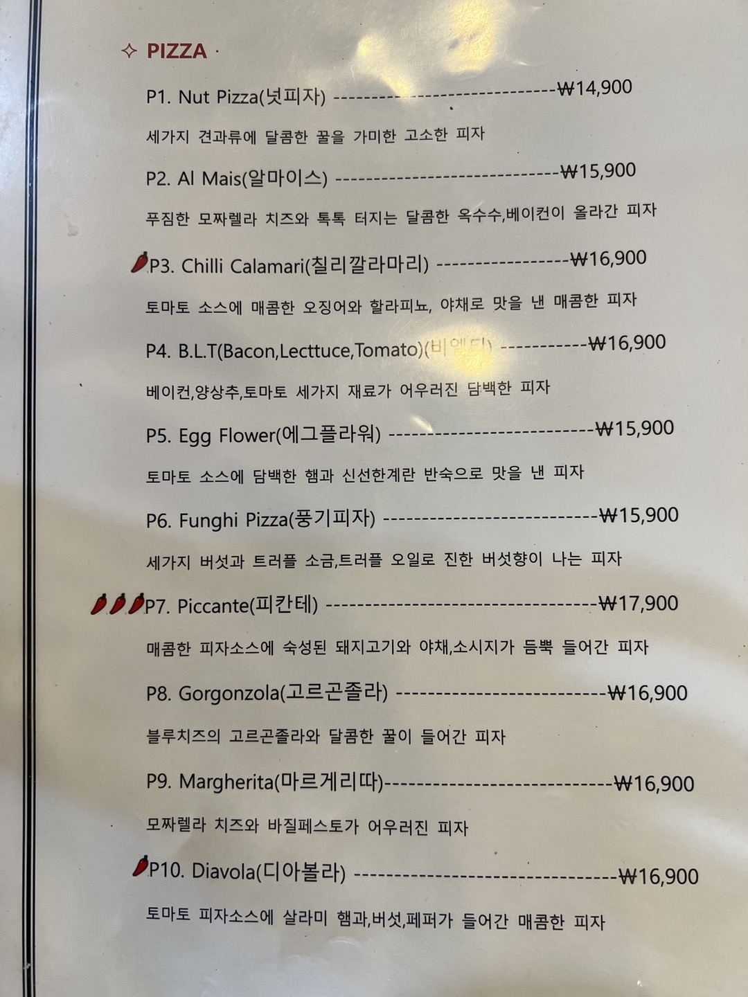 메뉴는 아래와 같다. 다른 파스타집과 비슷하게 샐러드,피자, 파스타, 리조또를 팔았다. 우리는, 알마이스 피자, 쉬림프핫치킨파스타, 뽀도도로앤모짜렐라를 시켰다.