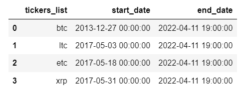 ticker_df = pd.DataFrame({"tickers_list" : tickers_list, "start_date" : start_date_list, "end_date" : end_date_list})
