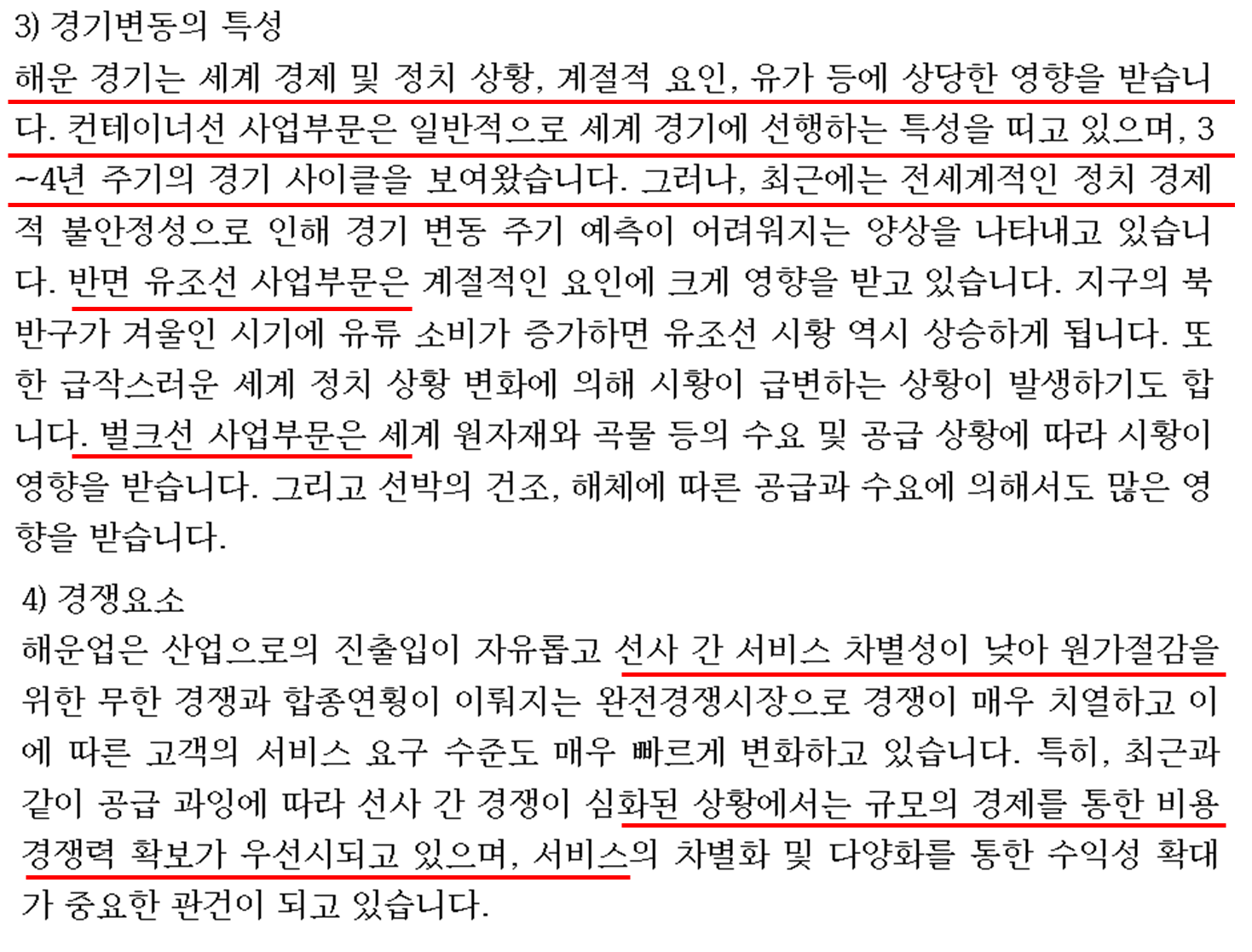 아래에 보면 해운업은 세계 경기변동과 상관관계를 가지고 있다고 설명되어 있다.