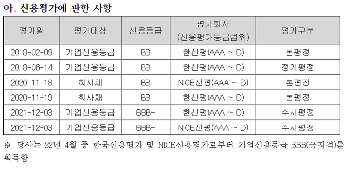 신용평가는 생각보다 좋지 않았다. 2021년 12월 3일 기준으로 BBB-이다.