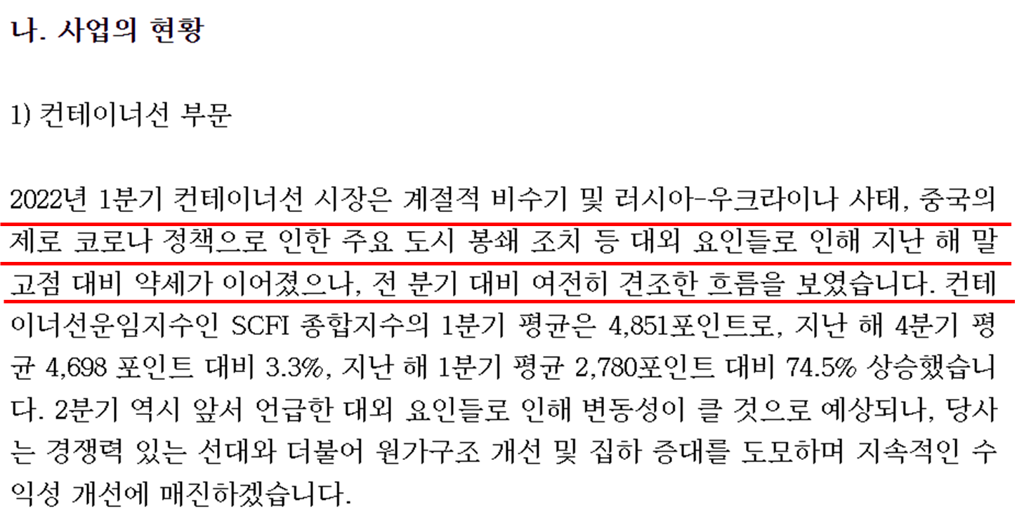 컨테이너 부문은 현재 러시아-우크라이나 사태, 중국의 제로 코로나 정책으로 지난해에 비해 약세라고 한다.