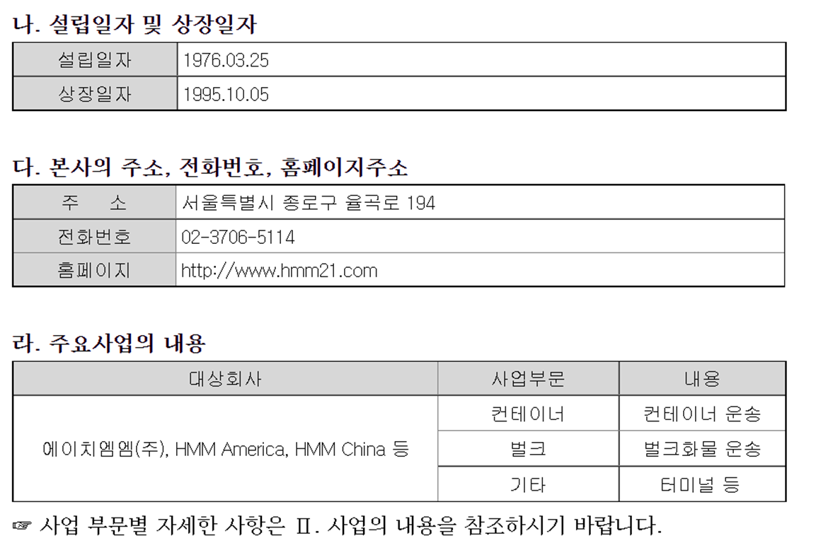 해당 내용들은 Dart에서 가지고 왔다. HMM의 주요 사업은 크게 컨테이너 운송, 벌크 운송, 기타 운송으로 나뉜다.