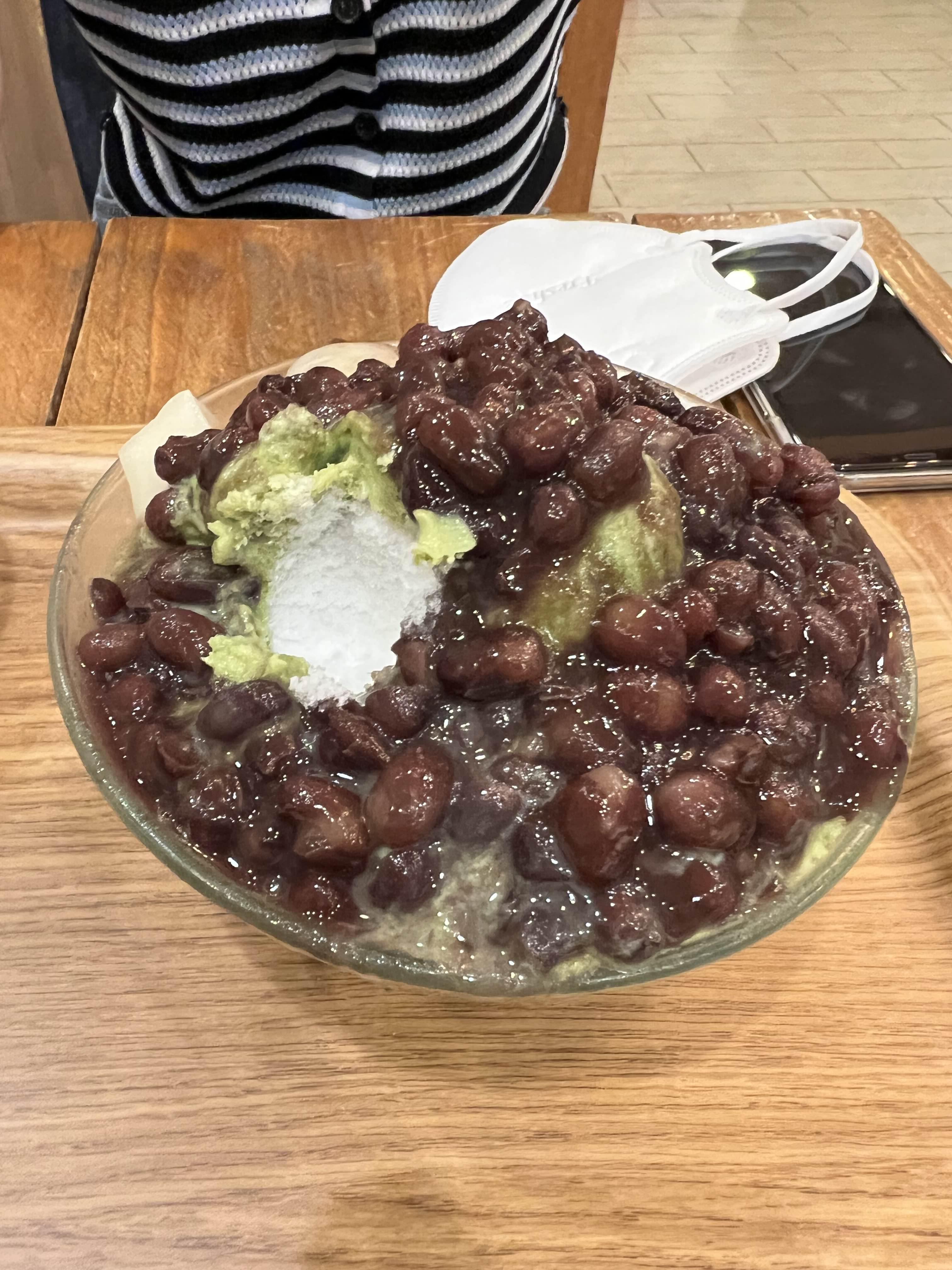 우리는 어떻게 먹어야 할지 몰라서 일단 팥을 부워서 먹긴 했는데 넘쳤다. 내가 보기엔 팥빙수를 좀 먹다가 부워야 되지 않을까 싶다. 빙수는 겉은 녹차맛이였고 안은 일반 빙수였다.